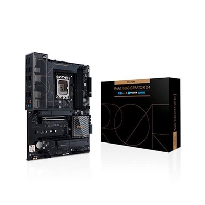 ASUS PROART B660-CREATOR D4. Fabricante de procesador: Intel, Socket de procesador: LGA 1700, Procesador compatible: Intel® Celeron®, Intel® Core™ i3, Intel Core i5, Intel Core i7, Intel Core i9, Intel® Pentium® Gold. tipos de memoria compatibles: DDR4-SDRAM, Memoria interna máxima: 128 GB, Tipo de ranuras de memoria: DIMM. Interfaces de disco de almacenamiento soportados: M.2,PCI Express 3.0,PCI Express 4.0,SATA III, Tipos de unidades de almacenamiento admitidas: HDD & SSD. Conector USB: USB tipo A, USB Tipo C. Tipo de interfaz ethernet: 2.5 Gigabit Ethernet, Gigabit Ethernet